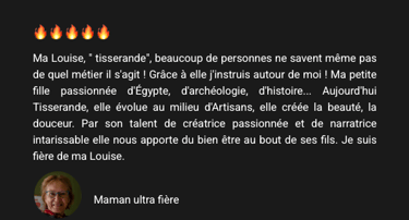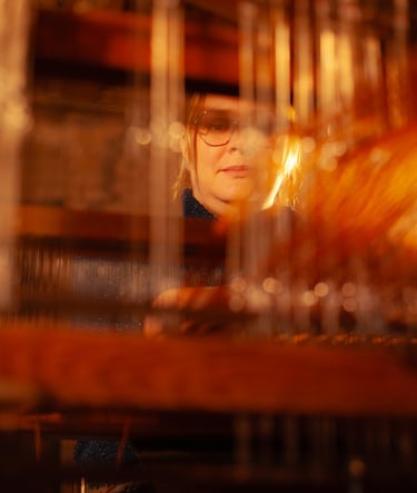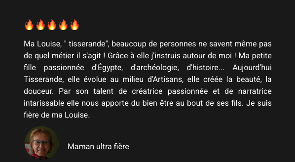 Alors pour résumer mon parcours : après une licence d'histoire et d'archéologie, puis un master de Responsable communication, j'ai travaillé dans l'industrie navale. J'ai adoré mon poste, moins ma direction, et finalement je suis partie. La même année, en 2023, j'ai commencé ma formation pour devenir tisserande et je suis installée à mon compte depuis l'automne 2024.