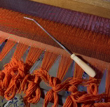 Une fois l'attachage réalisé, on commence ENFIN à tisser ! Mais attention, c'est le moment du suspense : je vérifie si toute l'installation est bien faite, si je n'ai pas d'erreur de pattern (d'enfilage), et si tous les fils se lèvent bien sur mon métier à tisser.