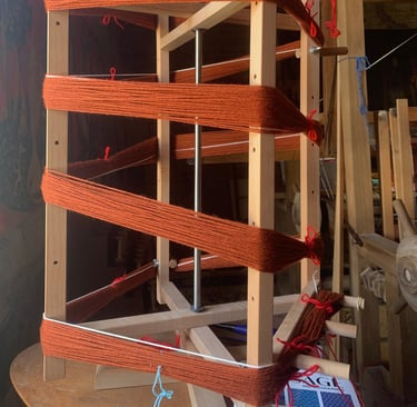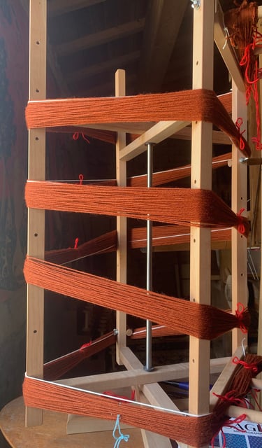 L'ourdissage : je prépare tous les fils de la chaîne (ceux qui vont dans le sens de la longueur du métier à tisser).